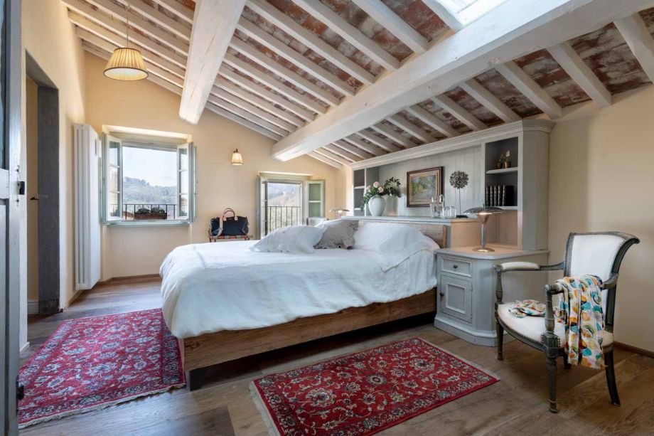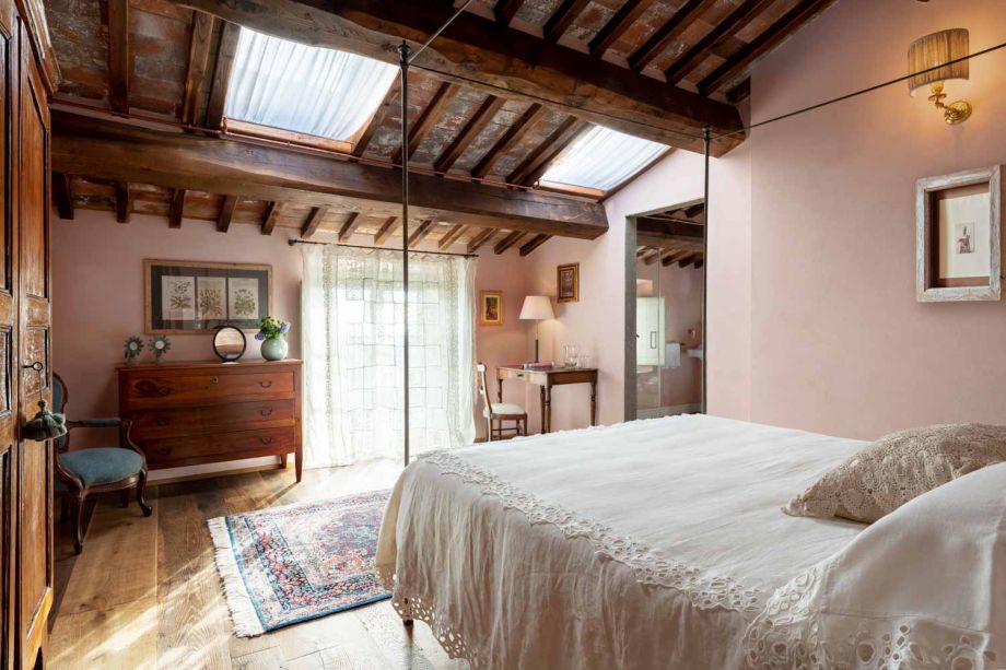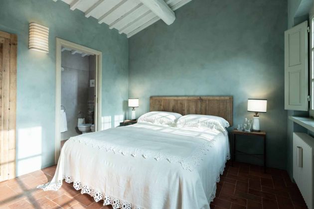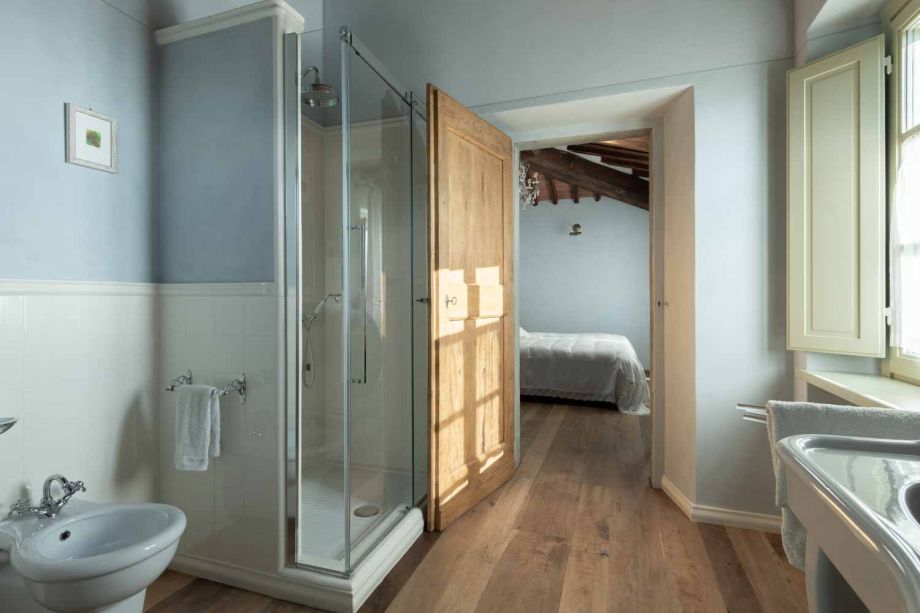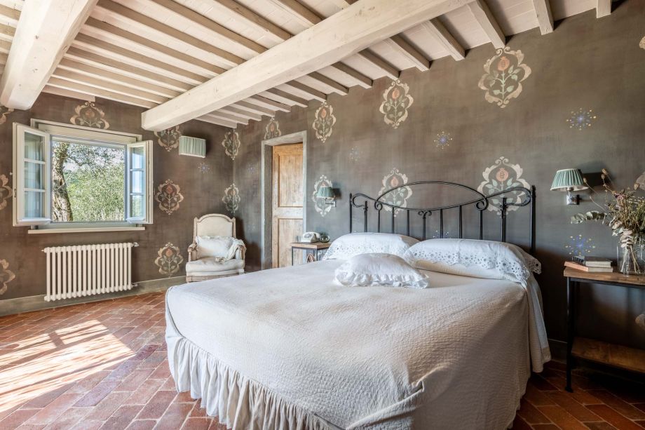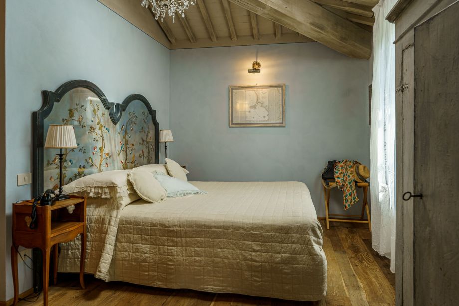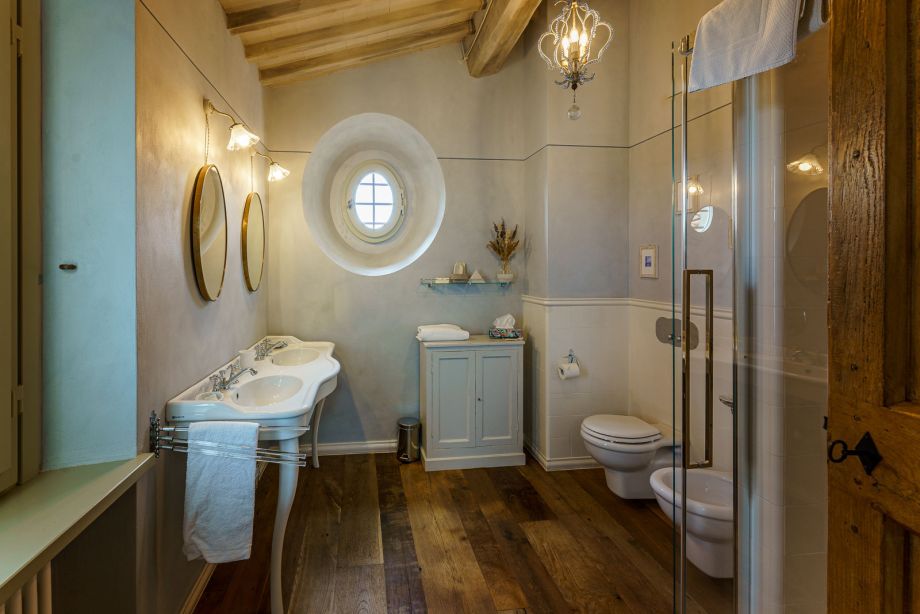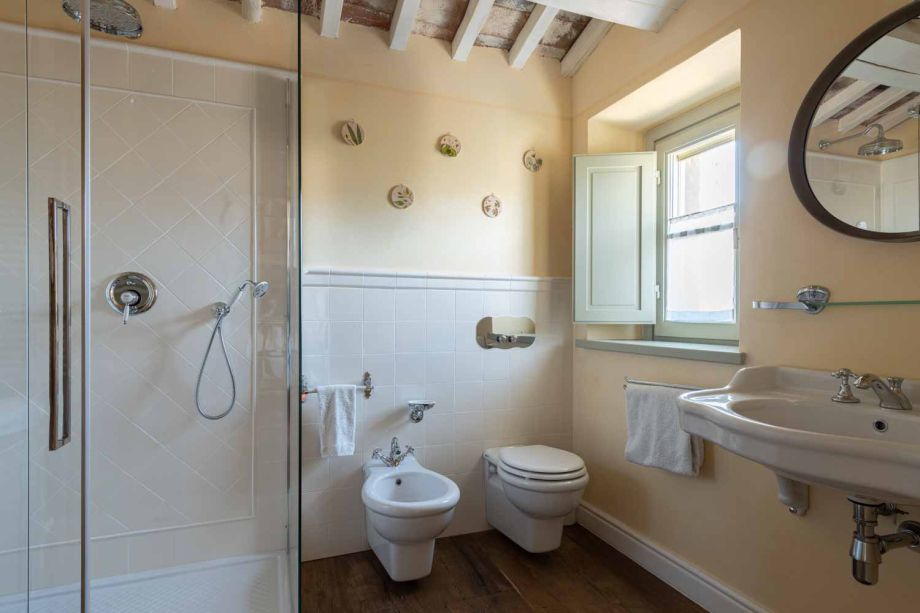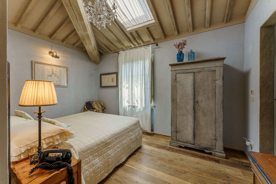Al primo piano dell’abitazione principale, con affaccio a sud, letto matrimoniale con testata dipinta a olio e un ampio bagno con doppio lavabo e due finestre, una delle quali regala un piccolo scorcio panoramico sul castello di Buggiano.