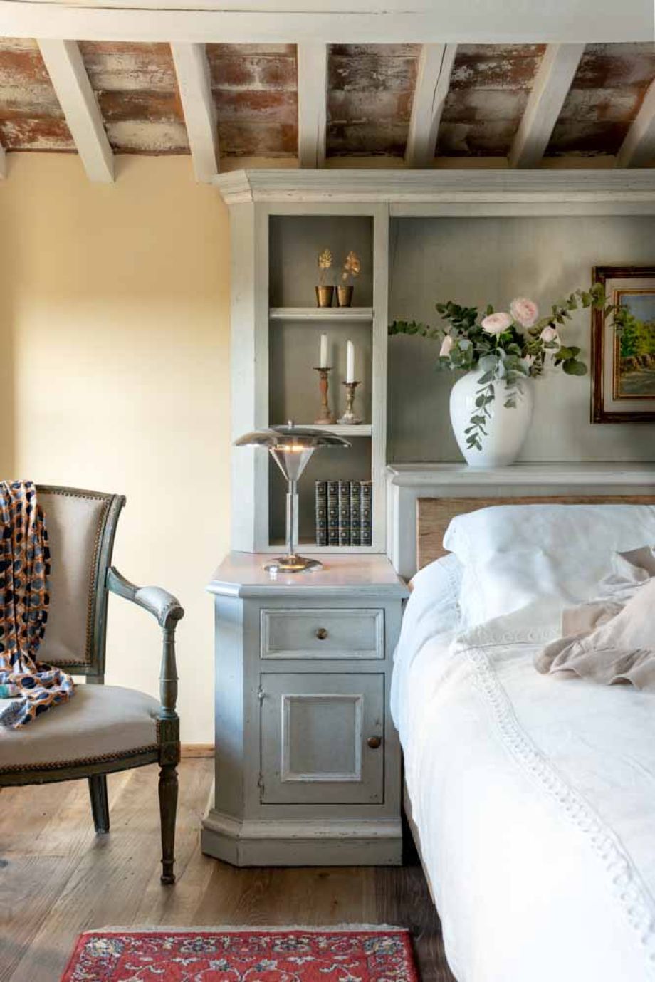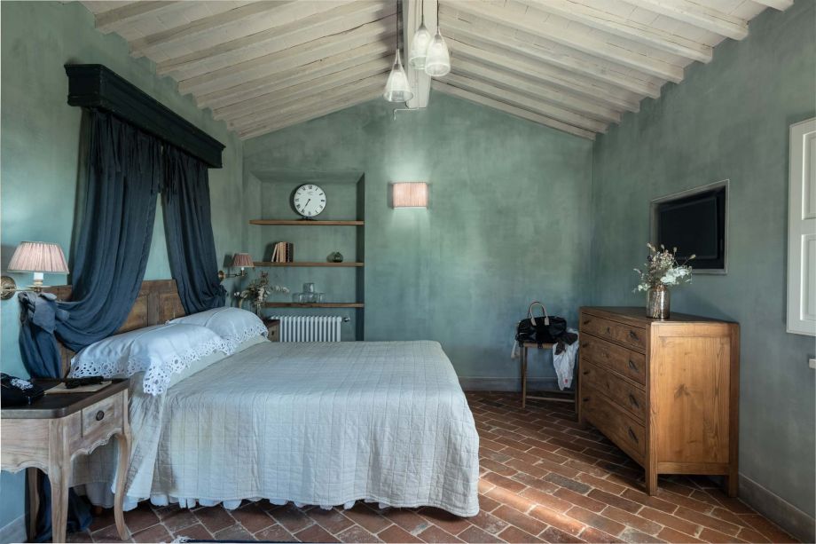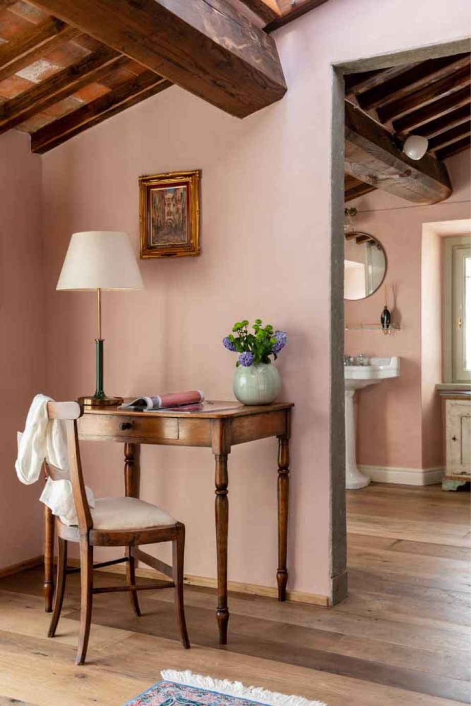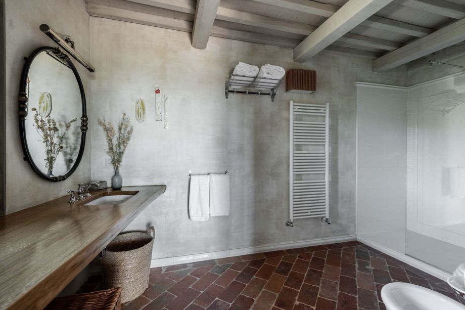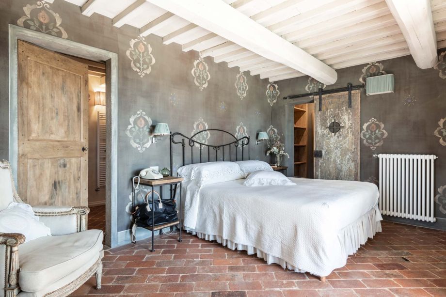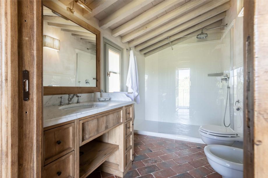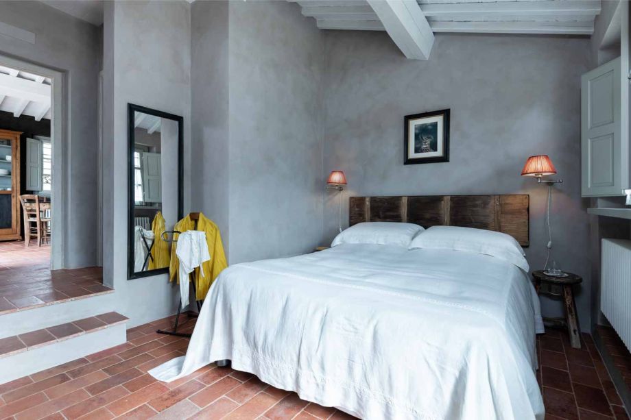 Al primo piano dell’abitazione principale, con affaccio a sud, letto matrimoniale con testata dipinta a olio e un ampio bagno con doppio lavabo e due finestre, una delle quali regala un piccolo scorcio panoramico sul castello di Buggiano.