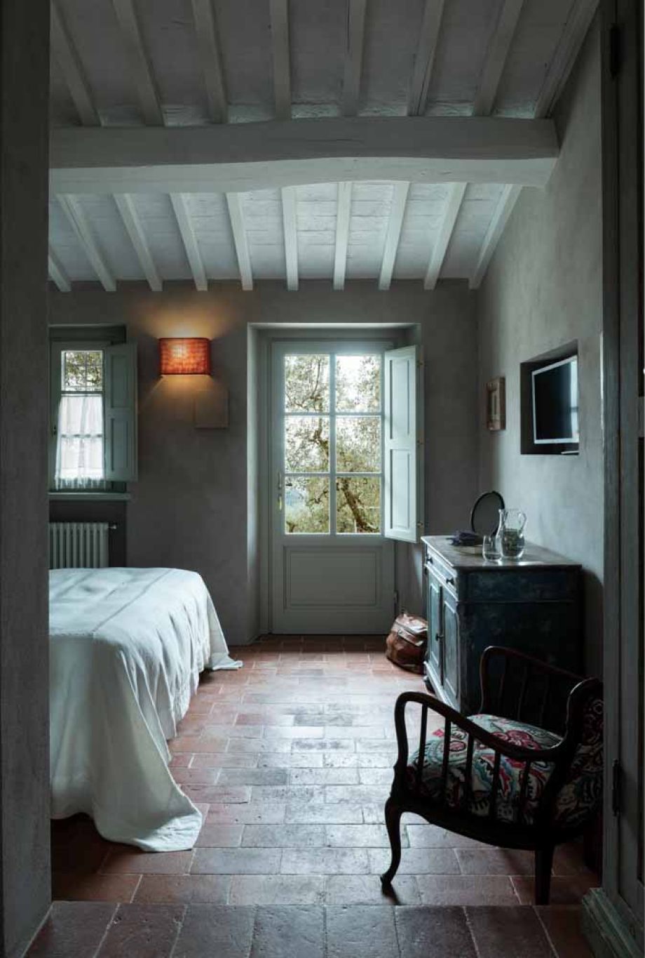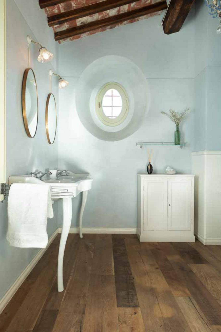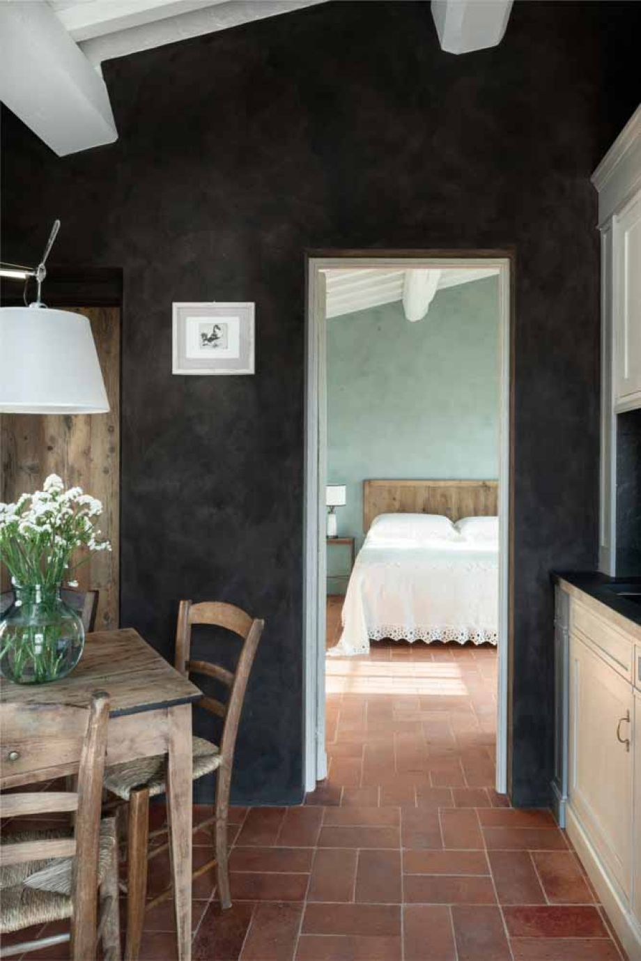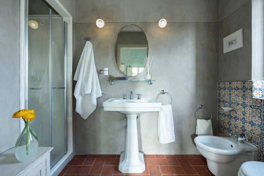 Al primo piano dell’abitazione principale, con affaccio a sud, letto matrimoniale con testata dipinta a olio e un ampio bagno con doppio lavabo e due finestre, una delle quali regala un piccolo scorcio panoramico sul castello di Buggiano.