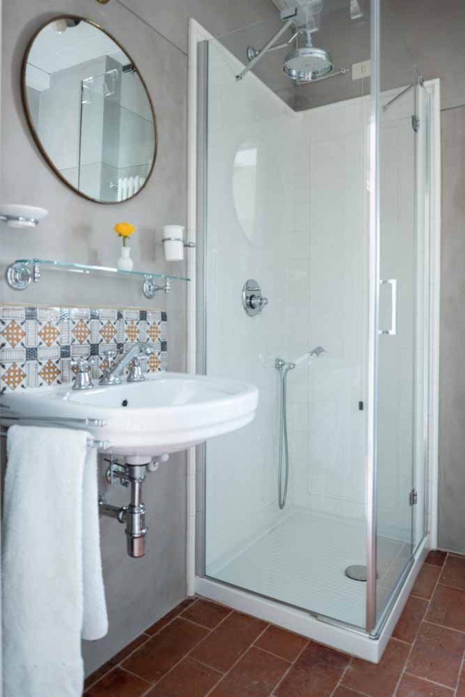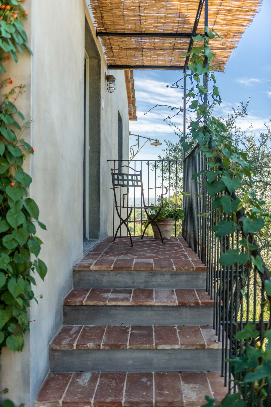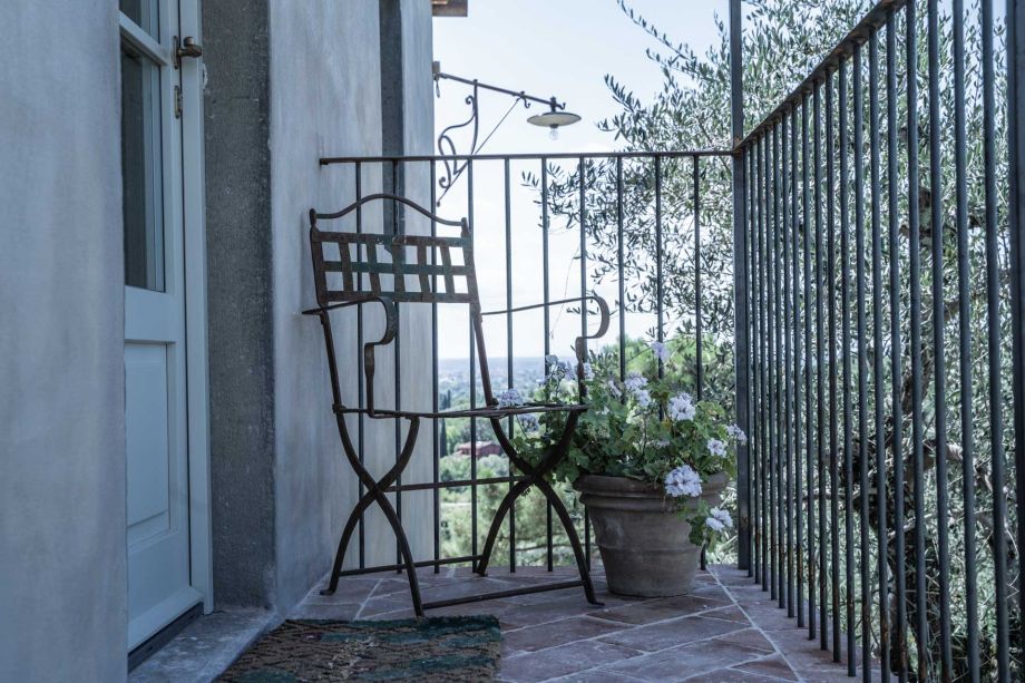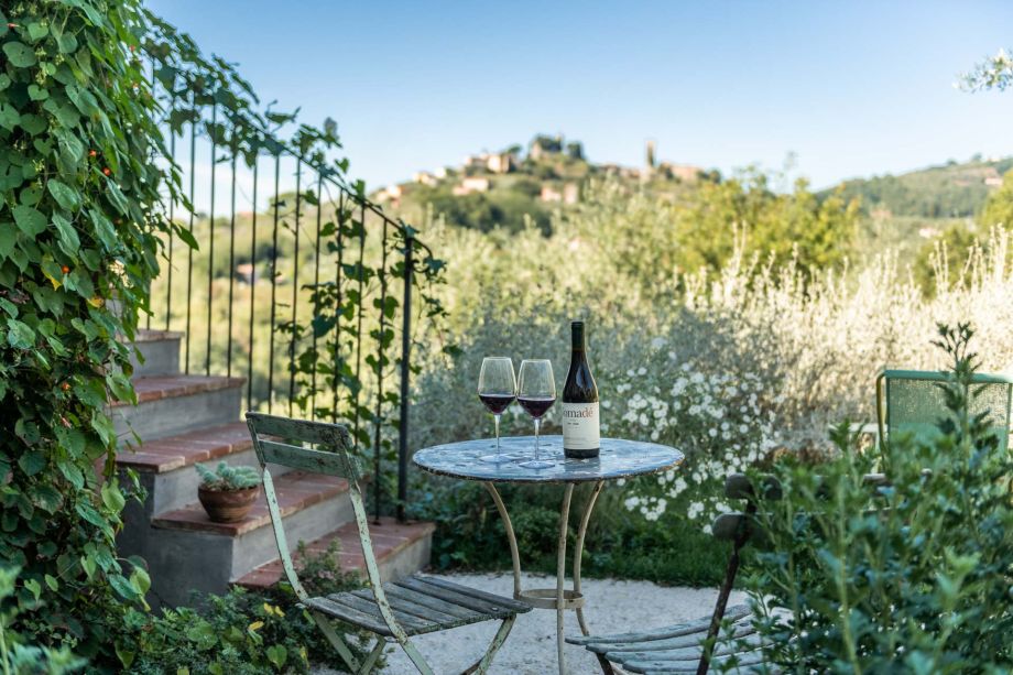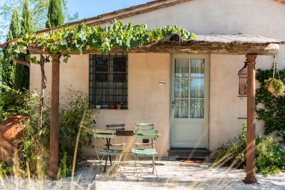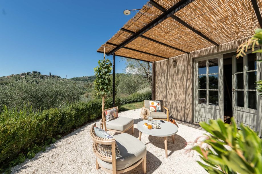La stanza ha l’accesso diretto all’esterno con un piccolo spazio verde privato a disposizione con poltrone e ombreggiato da una piccola pergola, dal quale si gode una bellissima vista sul borgo medioevale di Buggiano Castello.