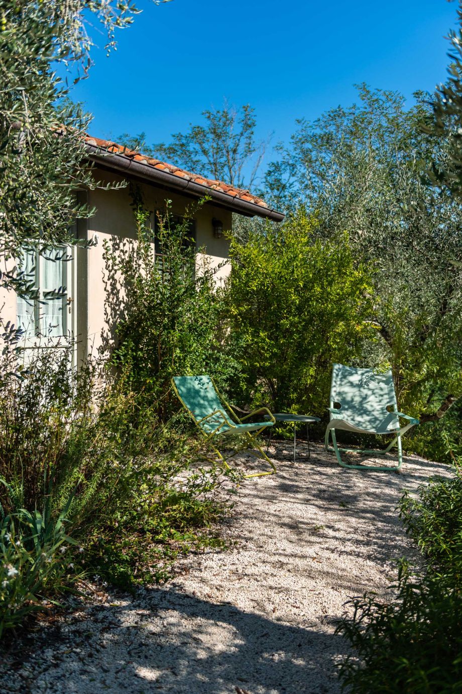 La stanza ha l’accesso diretto all’esterno con un piccolo spazio verde privato a disposizione con poltrone.