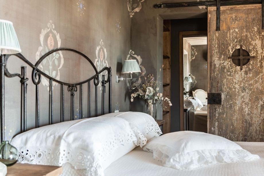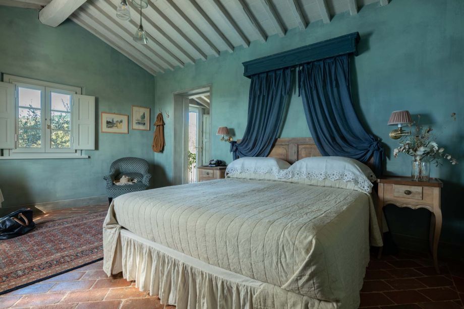 Al primo piano dell’abitazione principale, con affaccio a sud-ovest, letto matrimoniale a baldacchino in ferro battuto e ampio bagno con due finestre.